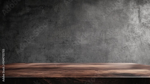 A panoramic banner mockup featuring a dark walnut table with a concrete wall backdrop, providing ample blank space for commercial text overlay, ideal for industrial or modern promotions