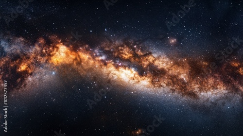 A panoramic shot of the Milky Way galaxy with bright stars, glowing nebula clouds, and cosmic dust, creating a mesmerizing cosmic display.