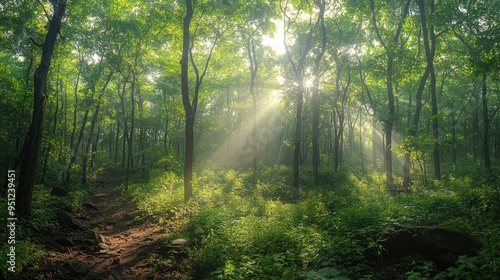 A panoramic view of a forest with dense, green foliage and sunlight filtering through the trees, creating a serene and refreshing natural backdrop.