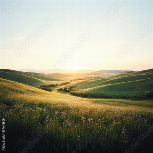 A panoramic view of a large meadow, where the grass is gently waving in the wind, with a clear, bright sky stretching overhead, and soft light illuminating the landscape