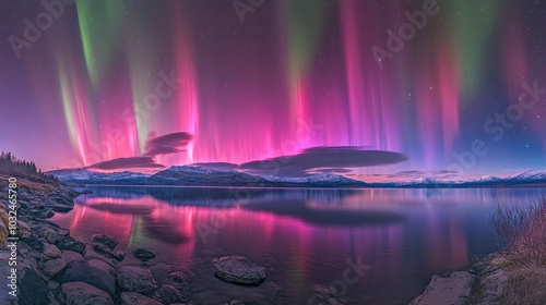 A panoramic view of a vibrant aurora borealis display over a tranquil lake with rocky shores and distant mountains under a starry twilight sky.