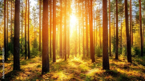 A panoramic view of an autumn forest with tall trees and vibrant leaves, showcasing the beauty of nature in its changing seasons