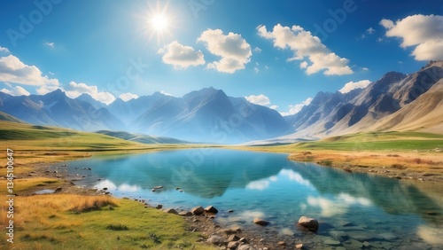 A panoramic view of lush, rolling hills blanketed in greenery under a soft, blue sky.
