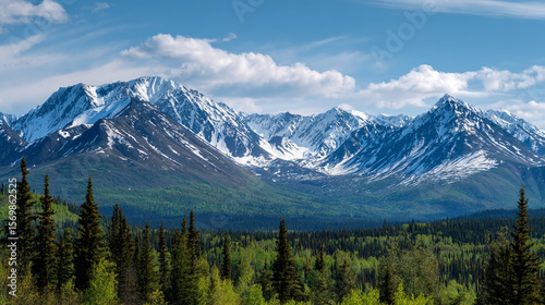 A panoramic view of the Alaska Range mountains with snow-capped peaks and lush green forests, isolated on a white background