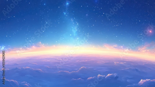 A panoramic view of the blue sky fading into a starry galaxy, with the horizon painted in soft pastel colors.