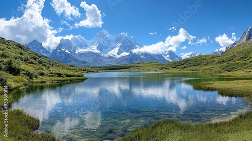 A panoramic view of Yading Nature Reserve, showcasing snow-capped mountains, clear alpine lakes, and lush green valleys under a blue sky.