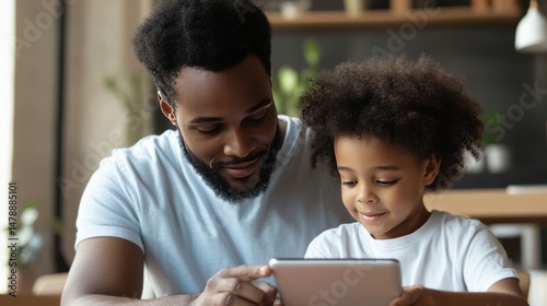 A parent setting healthy screen time rules for their child, using a timer for limited tablet usage,