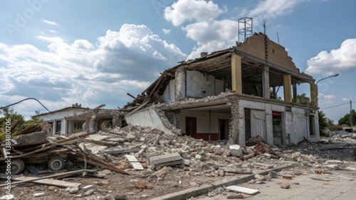 A partially collapsed building amidst rubble, with blue skies and clouds in the background, showcasing the aftermath of destruction.
