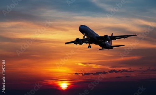 A passenger plane flying in the sky at sunset