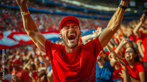 A passionate sports fan in a red shirt and cap, cheering with arms raised in a packed stadium, capturing the energy and excitement of a live event.