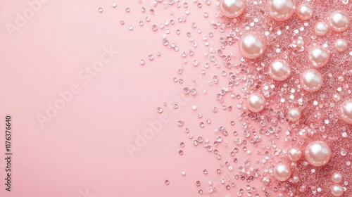 A pastel pink background adorned with sparkling glitter and scattered pearl decorations, creating an elegant design with ample copy space