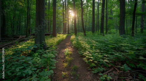 A path through a forest with sunlight shining through the trees