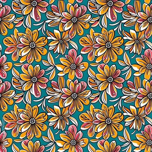 A pattern of colorful flowers on a blue background.