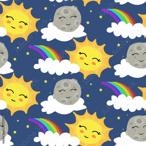 A pattern with a cute sun, moon and rainbow in the clouds. Children's illustration. Printing on paper and textiles. Gift wrapping, background for postcards, banner, fabric.