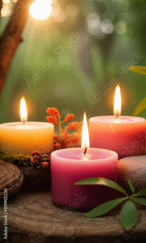 A peaceful and relaxing atmosphere with burning candles on a dark background. Relaxing evening in a cozy Thai resort. Suitable for spa and beauty themes.