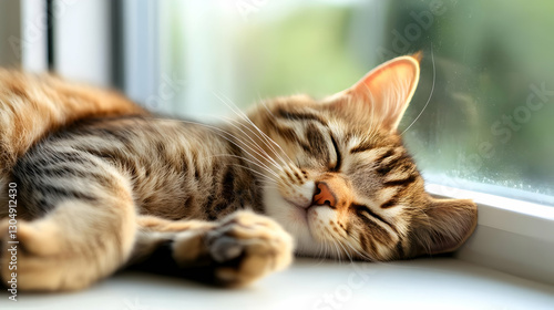 A peaceful cat sleeping by the window, enjoying sunlight in a serene and cozy atmosphere, perfect for animal lovers.