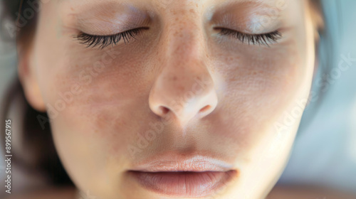 A peaceful close-up view of a woman's face with closed eyes, capturing the tranquility and subtle details of her natural complexion.