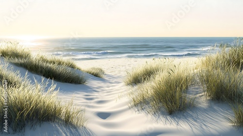 A peaceful coastal dune landscape, with rolling sand dunes covered in grasses, a gentle breeze, and the ocean in the distance under a clear sky