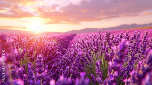 A peaceful countryside scene with lavender fields undulating in the breeze under a golden sunset.