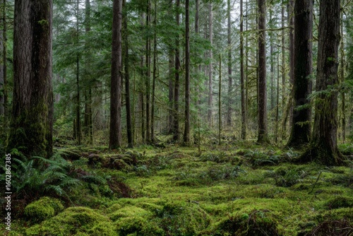 A peaceful moment in a Pacific Northwest forest reveals towering trees, dense ferns, and lush moss, creating a vibrant habitat teeming with life and tranquility