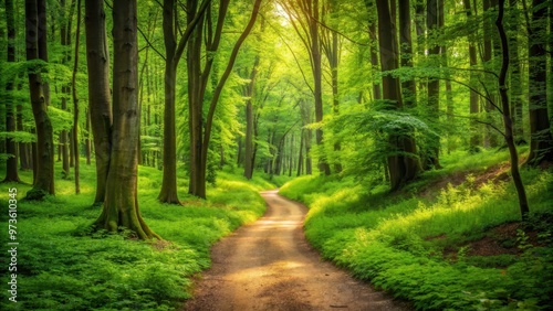 A peaceful path winding through a lush green forest , nature, trail, serene, pathway, trees, foliage, walkway