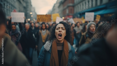A peaceful protest with people holding signs advocating for women's rights, with diverse individuals marching together in unison.generative ai illustration