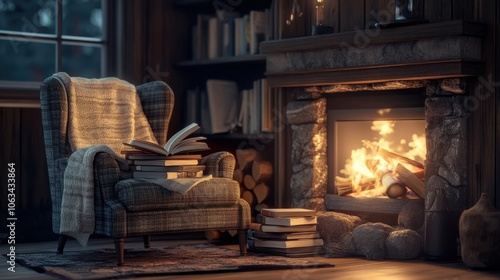 A peaceful reading nook by a crackling fire, with a comfortable armchair,