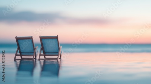 A peaceful scene showing two empty beach chairs on a tranquil beach with the calm ocean and a beautiful sunset in the background, representing relaxation and tranquility.