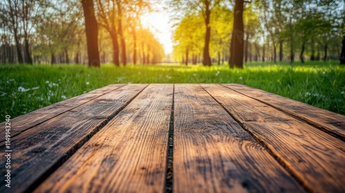 A peaceful spring background with lush green foliage and an empty wooden table in nature, with soft sunlight and bokeh effects, perfect for showcasing natural beauty and tranquility.