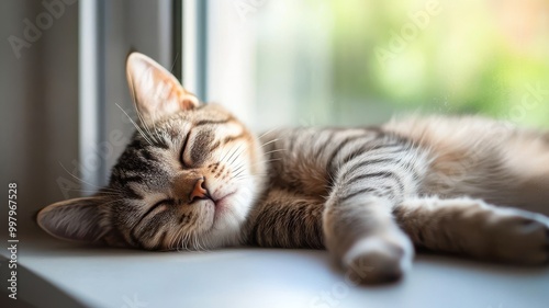 A peaceful tabby cat resting on a windowsill, basking in sunlight.