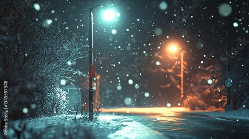 A peaceful winter night with snowflakes falling and a soft glow from a streetlamp