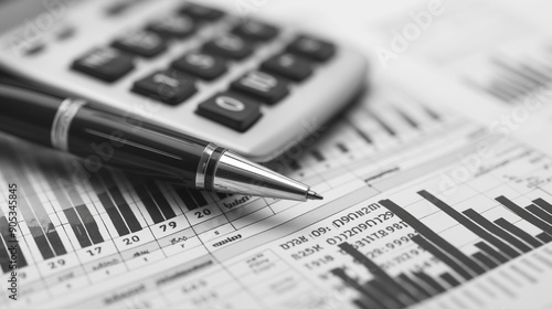 A pen, calculator, and financial graphs on a desk, symbolizing business analysis and financial planning.
