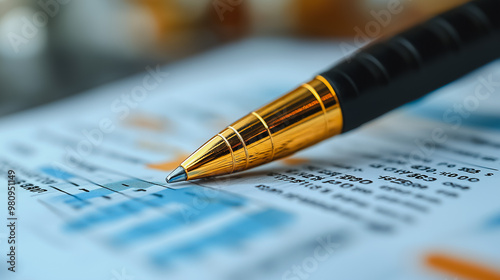 A pen is on a piece of paper with numbers and graphs. The pen is black and gold
