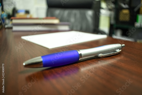 A pen sits in the focus surrounded by the office it never leaves on a dark brown desk next to a black leather chair right in front of some textbooks. A white note pad waiting to be written on