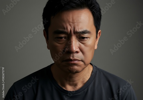 A pensive man's somber reflection, captured in moody low-key lighting against a neutral backdrop.