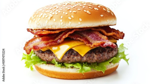 A perfectly assembled bacon cheeseburger with a sesame seed bun, crispy bacon strips, melted cheese