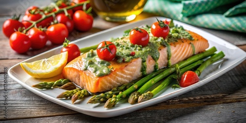 A perfectly baked salmon fillet topped with a colorful arrangement of fresh asparagus spears and juicy cherry tomatoes, drizzled with a zesty herb sauce , herb sauce, tomato recipe