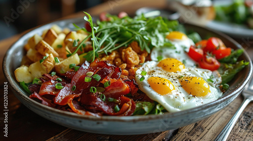 A Perfectly Cooked Fried Egg With Salads In Plate On Blurry Background