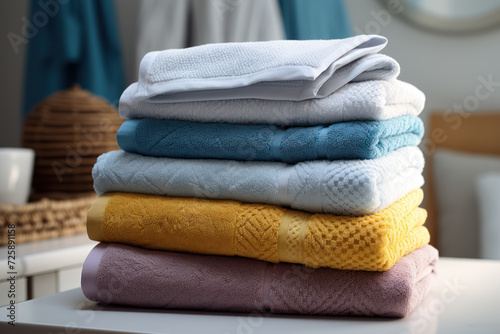 A perfectly folded stack of crisp, clean towels, symbolizing the comfort and luxury associated with fresh linens. Generative Ai.
