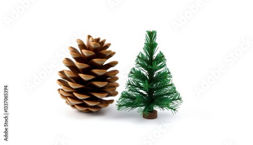 A perfectly formed green pine cone next to a miniature Christmas tree, both isolated on white, christmas tree, decoration