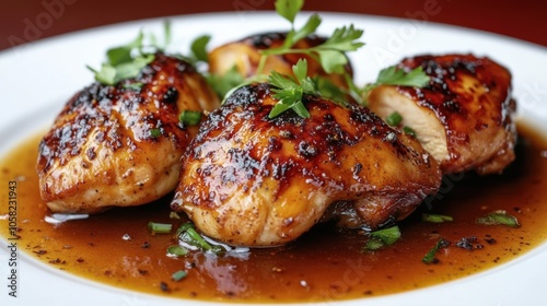 A perfectly plated garlic butter chicken with a glossy sauce,