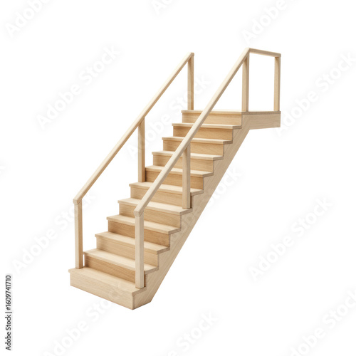 A perfectly rendered, exquisitely detailed miniature staircase crafted from smooth, light-toned, unpainted wood, with a contemporary minimalist design and elegant railing, isolated on a pristine,