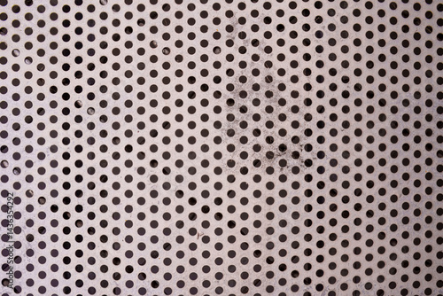 A perforated metal sheet with scattered rust and dark stains
