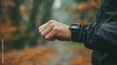 A person adjusting their fitness watch before starting a workout or exercise routine , wide background