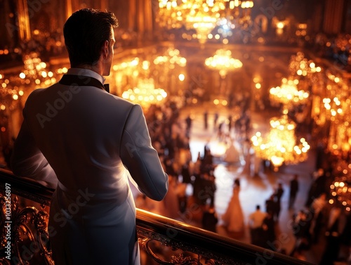 A person elegantly dressed in a suit, observing a grand ballroom event illuminated by golden chandeliers, embodying sophistication and high society gatherings.