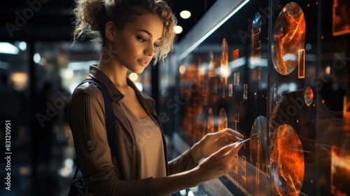 A person engages with an advanced, glowing interface with graphics of planets and data analysis