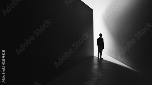 A person experiencing depression in a dark, minimalistic room, looking down, conveying sadness and isolation