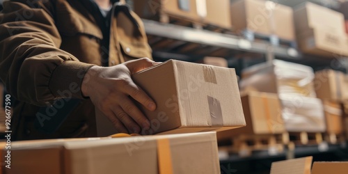 A person handling a package in a warehouse filled with cardboard boxes, showcasing logistics and storage operations.