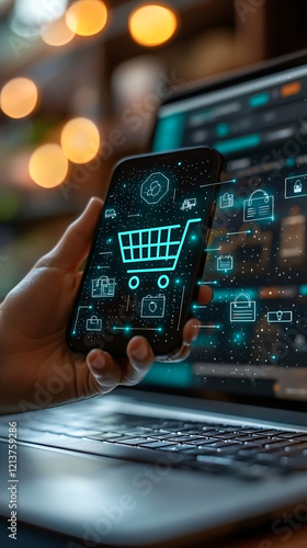 A person holding a smartphone with an online shopping cart icon on the screen, while a laptop displaying an e-commerce website is open on a desk.