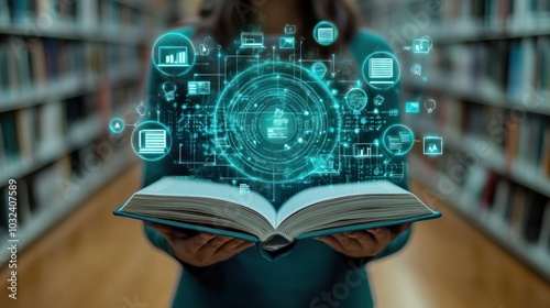 A Person Holding Open Book with Digital Technology Icons in the Air